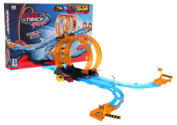 Podwójny tor wyścigowy z wyrzutnią dla dzieci od 3-go roku życia. Tor wykonano z najlepszej jakości plastiku w żywych kolorach. Na zestaw składa się 31 elementów do samodzielnego montażu. Tor posiada odcinki proste do rozpędzenia pojazdu, dwie pętlę 360 stopni i dwa pojazdy. Pojazdy napędzane są napędem pull back. Wystarczy delikatnie nacisnąć pojazd do tyłu, by przejechał tor z pełną mocą.