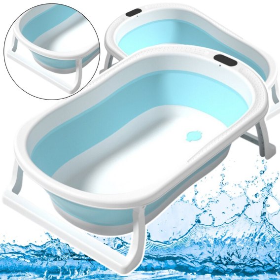 Niebieska, składana wanienka dla niemowląt z wbudowanym haczykiem do zawieszania. Wykonana z bezpiecznych, wolnych od ftalanów materiałów. Antypoślizgowe nóżki zapewniają stabilność.