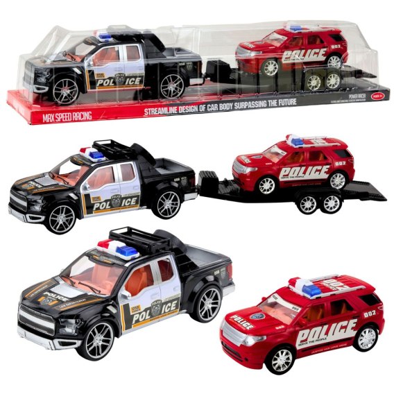 Zestaw policyjny z lawetą to doskonała propozycja dla dzieci, które uwielbiają dynamiczną zabawę i fascynują się światem służb mundurowych. W skład kompletu wchodzi potężny czarny samochód terenowy z przyczepą-lawetą oraz czerwony pojazd policyjny.